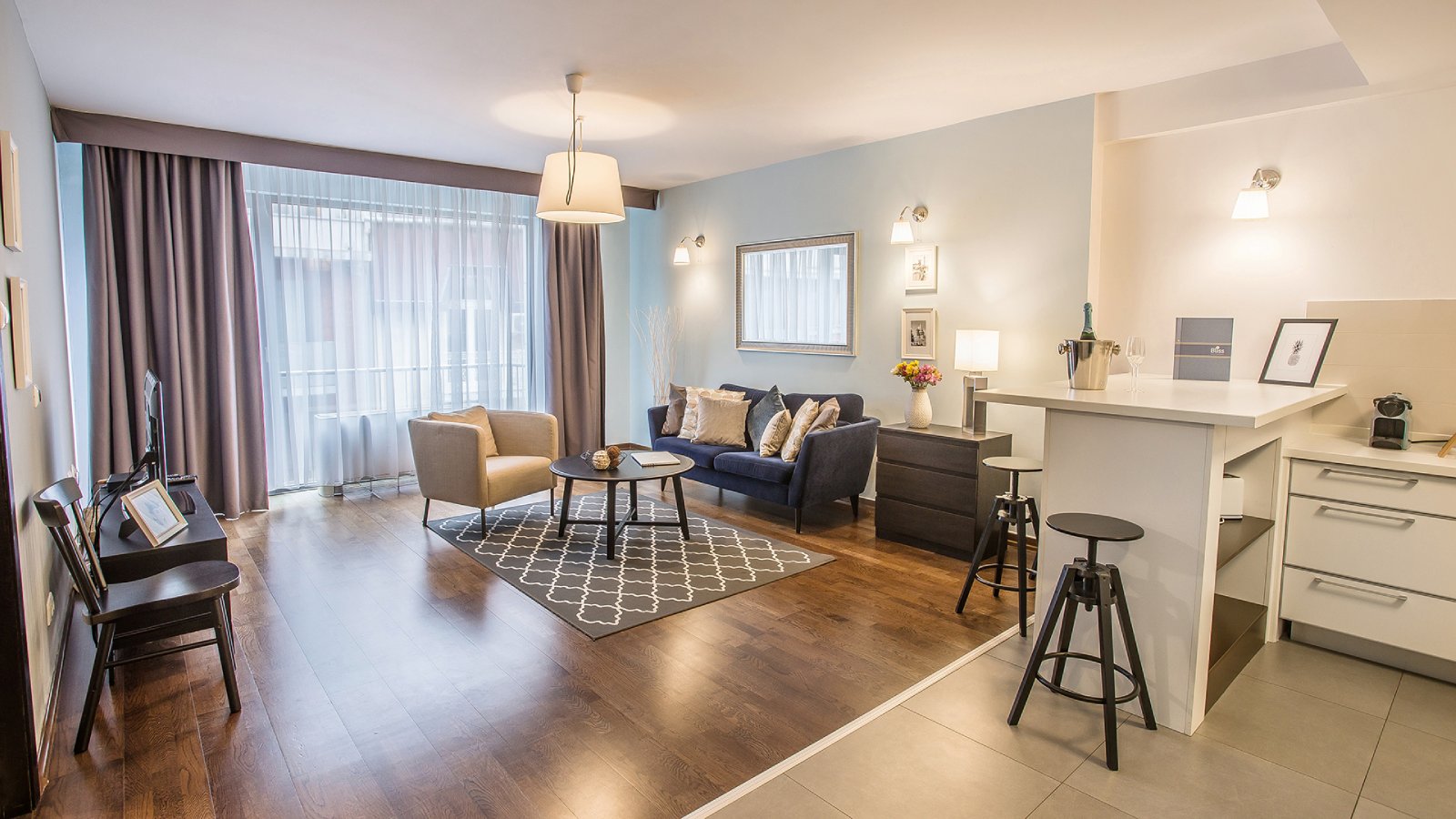 These modern design Superior One-Bedroom Apartments offers a comfortable stay for guests who enjoying a shorter or longer stay in the Hungarian capital. Each apartments have a unique and elegant design, which is a perfect choice for couples, families and business travelers alike. The 55-60 m2 apartments feature a bedroom with a luxurious double bed, a spacious air-conditioned living room, a well-equipped American style kitchen with a dining area and every comfort you need after a long day in Budapest. The living room includes a comfortable sofa, an LCD TV with a collection of local and international channels, a DVD player and complimentary Wifi Internet access. All of our guests are given free access to the Wellness & Fitness area. In addition, each apartment can be equipped with a washing machine to be used at the guests’ convenience.